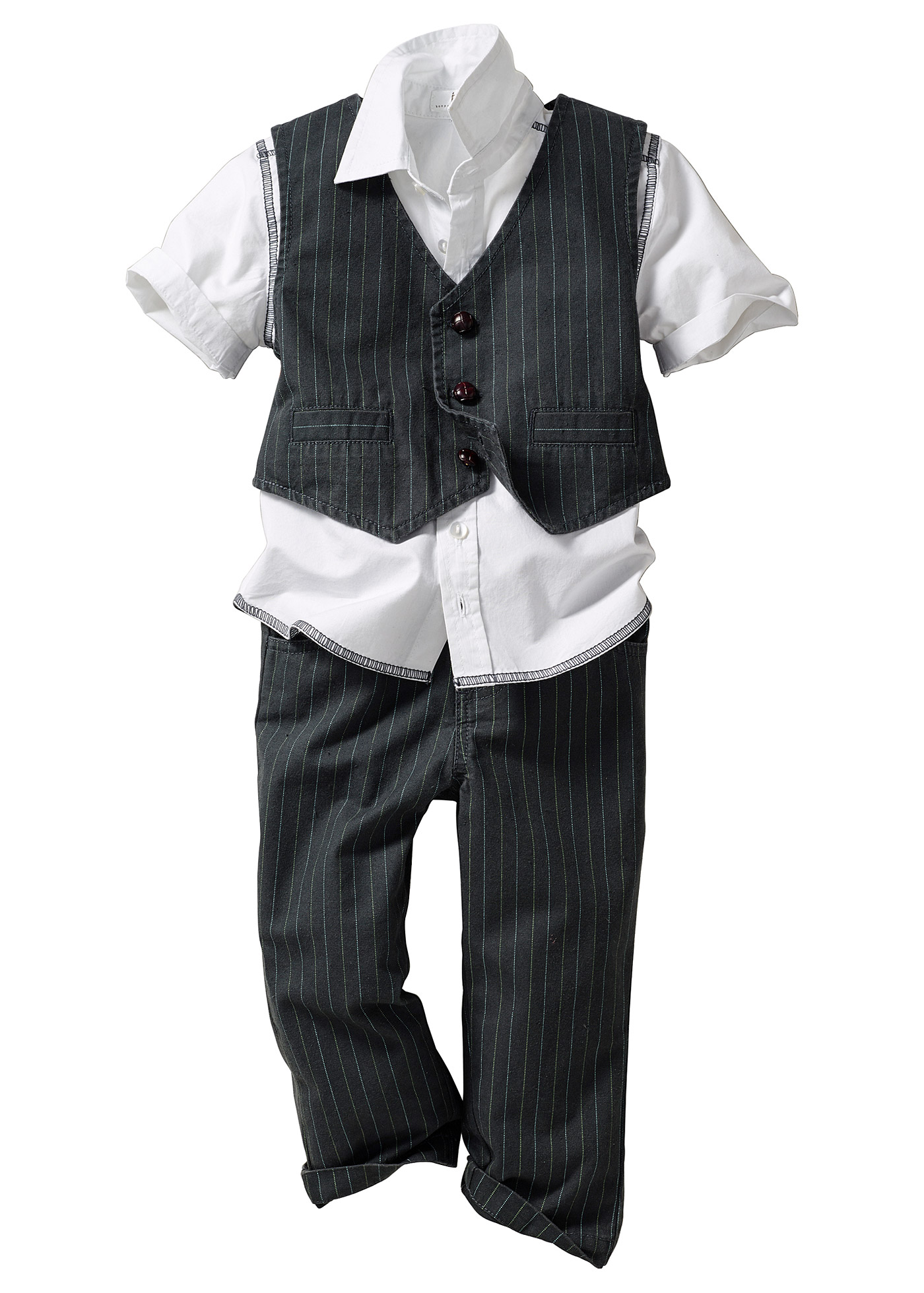3 изделия в наборе: брюки, жилет и рубашка. Шикарная рубашка с коротким рукавом, нагрудными карманами на пуговицах и стегаными швами. Жилет с V-образным вырезом застегивается на три пуговицы. Брюки на эластичном поясе со шлевками для ремня.