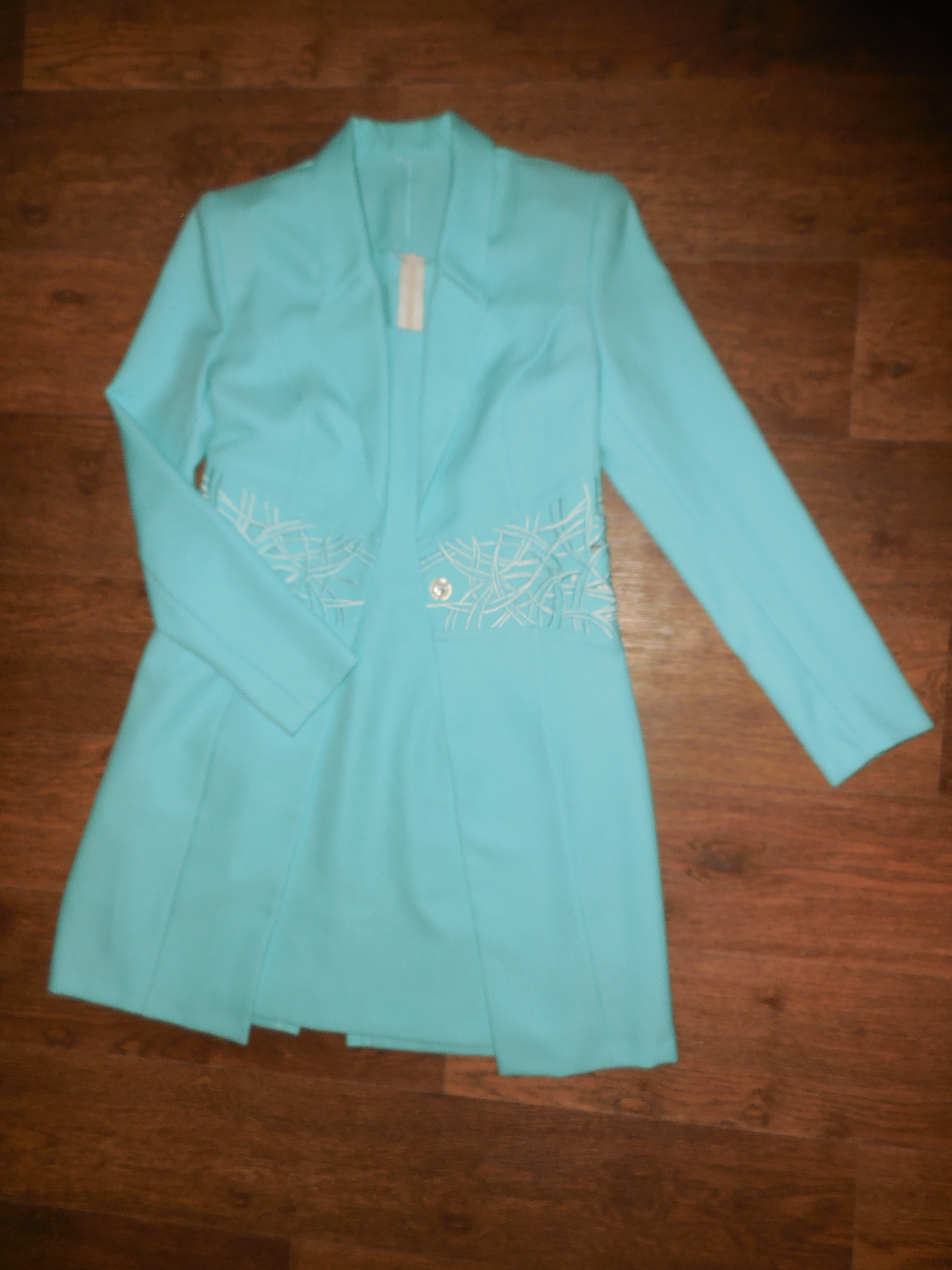 Замеры: пиджак - плечи 38 см, рукав 60 см, платье длина 83 см, От-70-72 см, ОБ-до 96см, ОГ - 84-88 см.